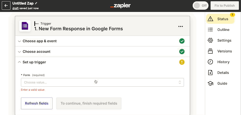 Selecciona el trigger que desencadenará la acción. Por ejemplo, “nuevo registro en Google Forms”.