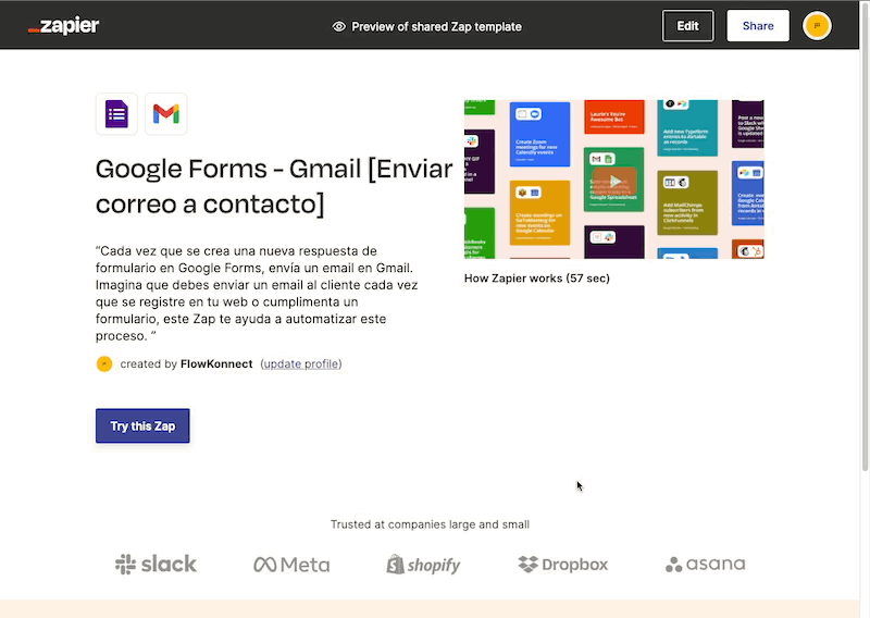 Al hacer clic en el siguiente enlace abrirá la automatización en tu cuenta de Zapier, solo tendrás que configurar tus credenciales de Google Forms y Gmail.